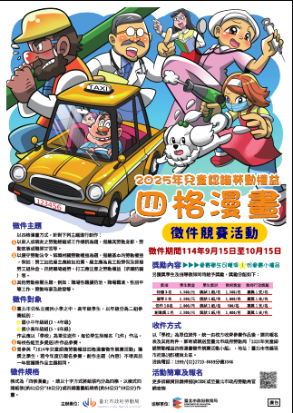 4、詳細獎勵內容參閱簡章。 三、詳細徵件內容請參考活動簡章,亦可至勞動局官網下載活 動簡章(勞動局官網〉業務服務〉勞動教育文化〉勞動教 育校園扎根〉兒童認識勞動權益四格漫畫徵件競賽活動, 網址:https://reurl.cc/WOdkb9下載。如有相關疑問,請 洽活動專線:(02)2720-8889/1999轉分機3346。