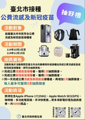 二、凡設籍臺北市市民符合公費流感及新冠疫苗接種者於114年 10月1日至11月15日期間,於本市合約醫療院所或接種站完 成公費流感疫苗或新冠疫苗接種者,即符合抽獎資格。活動期間共辦理2次抽獎,第1次抽獎未獲獎名單併入第2次抽 獎,得獎名單將分別於114年11月5日前及11月25日前公告於衛生局官網。