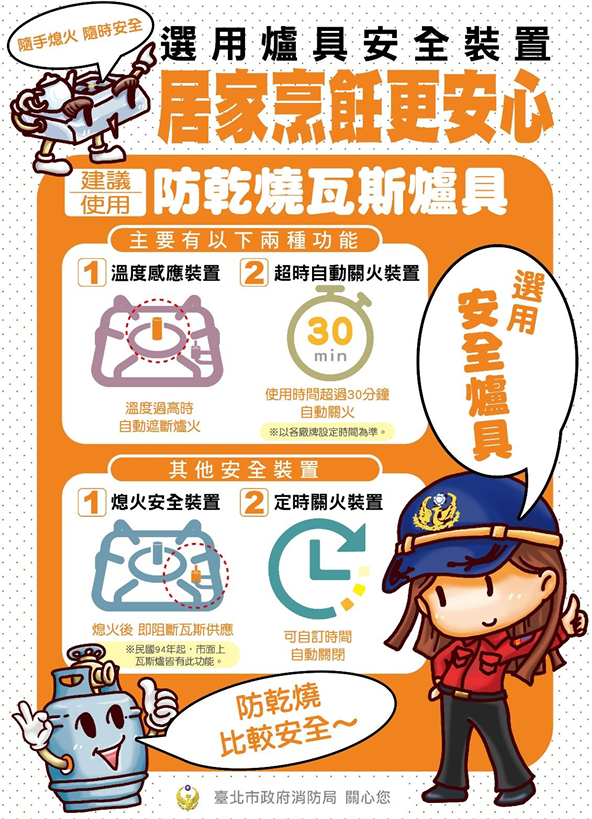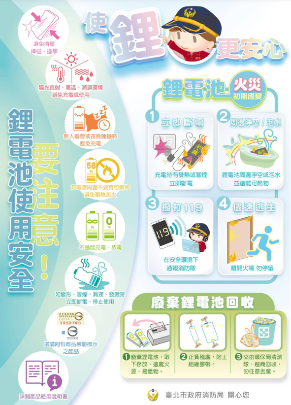 當鋰電池發生漏液、冒煙,立即斷電並淨空周圍可燃物,廢棄鋰電 池請於正負極處貼上絕緣膠帶,交由環保局或便利商店回收;烹調 注意人離火熄,並選購具備溫度感應、超時自動關火等防乾燒功能 之爐具。